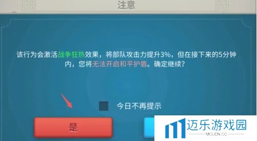 3、点击攻击后,产生【该行为会激活战争狂热效果,将部队攻击力提升3%,但在接下来的5分钟内,您将无法开启和平护盾。确定继续?】提示弹窗,点击是;