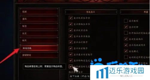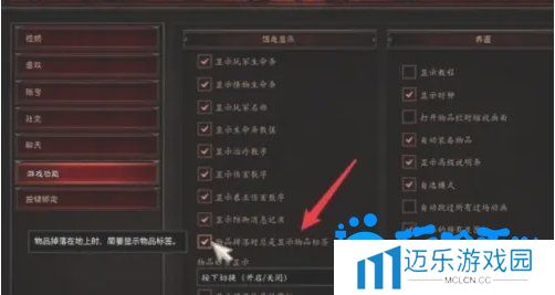 3、接着点击【物品掉落时,总是显示物品标签】然后勾选该功能;