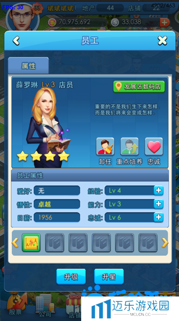 3、员工还可以使用G币进行升级,随着员工的升级还有概率获得随机技能;