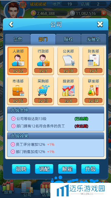 2、不同的部门对应着不同的加成功能,让公司运转获取收益