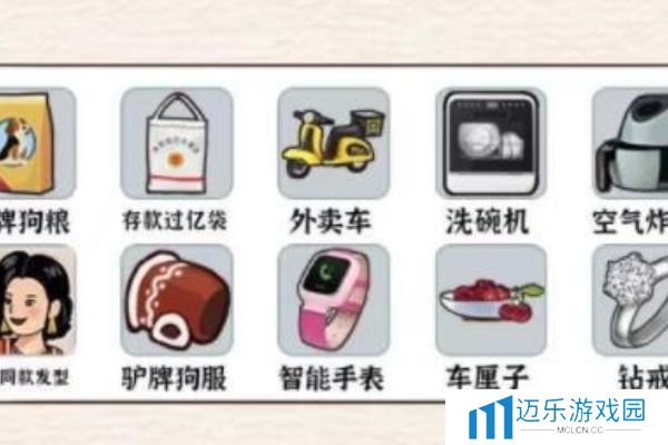2、金牌狗粮,存款过亿袋,外卖车,洗碗机,空气炸锅。