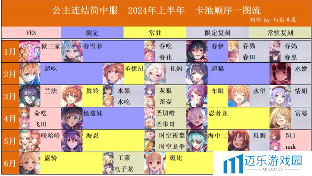 2024年国服卡池排期图简洁展示,帮助玩家了解角色池开放顺序,解决角色实装/复刻时间问题,方便制定抽卡计划。
