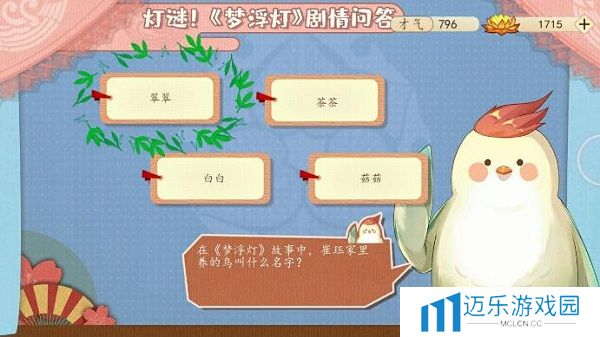 梦浮灯清明灯会活动中的其中一道题目:在《梦浮灯》故事中,崔钰家里养的鸟叫什么名字?崔珏家的小鸟名字听起来很清脆,下面小编就为大家带来了正确答案,快来看看吧。