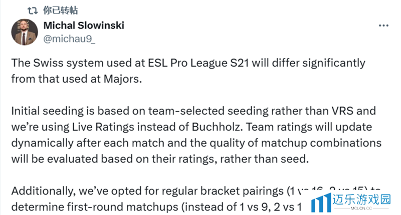而ESL首席裁判Michal Slowinski在社交平台上表示,本次EPL S21使用的瑞士轮体系不同于Major。