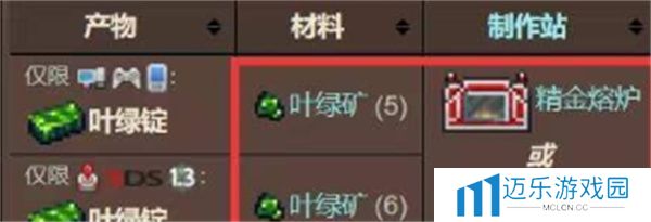 3、叶绿锭需要玩家们使用叶绿矿在精金熔炉或钛金熔炉中可以制作出来。