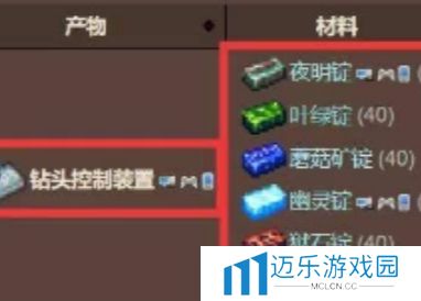 在游戏中,玩家们可以获得钻头控制装置,需要我们使用40个夜明锭、40个叶绿锭、40个蘑菇锭矿、40个幽灵锭、40个狱石锭和40个陨石锭,然后来到山铜砧或者秘银砧处,然后在此进行合成即可。