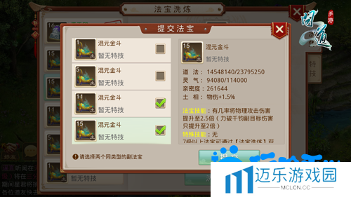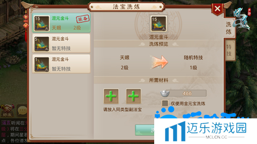 5、仅七级以上法宝可作为主法宝进行洗炼,副法宝没有等级限制,唯一限制的是相同类型法宝;