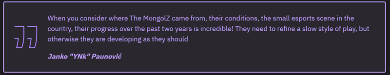 “当你考虑到The MongolZ来自哪里,他们所处的环境和国内小规模的电子竞技圈,他们过去两年的进步是不可思议的!他们需要完善一种较为缓慢的比赛风格,但除此之外,他们的成长是符合预期的。”