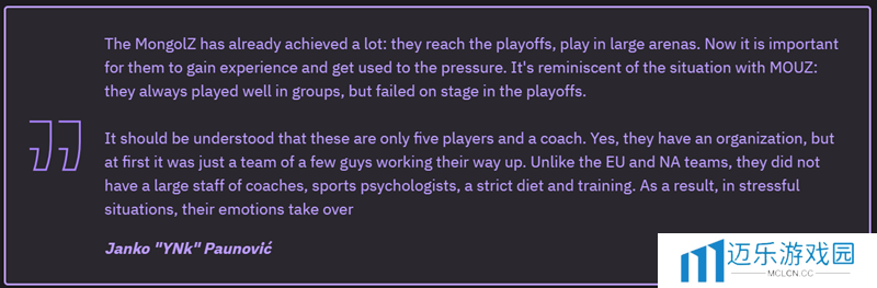 “The MongolZ已经取得了很多成就:他们进入了淘汰赛,在大型竞技场比赛。现在对他们来说,最重要的是积累经验并适应压力。这让我想起了MOUZ的情况:他们总是在小组赛中表现出色,但在淘汰赛阶段却总是失败。”