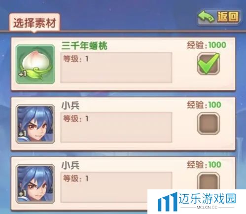 3、在神将升级页面选择素材时,勾选第一个三千年蟠桃并点击确定;