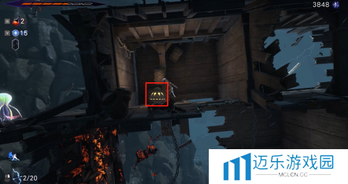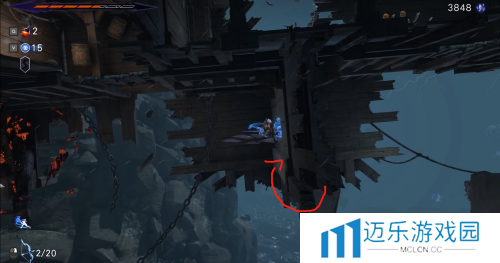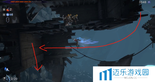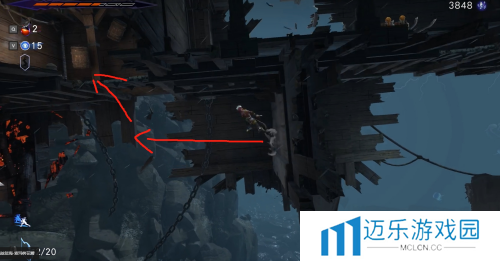 4、更新完回溯点后,可以飞跃到左下方的木墙上,随即慢慢往下滑动。