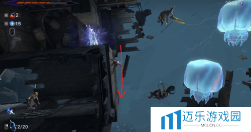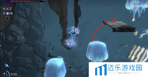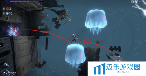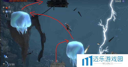2、跳到前方平台,然后连续往上跳跃过两个水母,到第二个平台,注意水母发电会受到伤害。