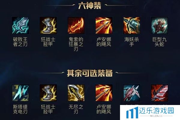破败王者之刃、狂战士胫甲、鬼索的狂暴之刃、卢安娜的飓风、海妖杀手、巨型九头蛇。