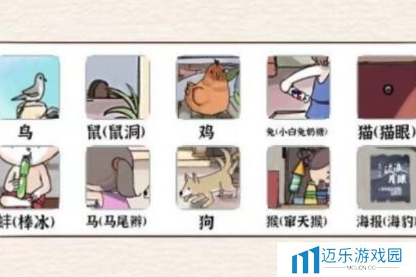 2、鼠(鼠洞),鸟,鸡,兔(小白兔奶糖),猫(猫眼)