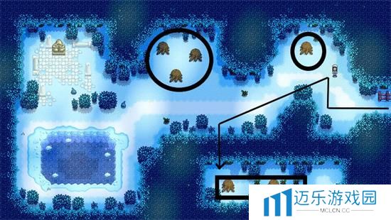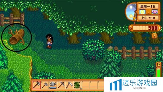 2.玩家将斧头升级到钢斧头后可以砍伐枯树干。在农场下方煤矿森林的左上角,巫师塔上方,玩家可以发现一个枯树干,用钢斧头劈碎,就可以进入秘密森林。秘密森林**有6个大树桩,每天可提供12个硬木。秘密森林下方的树丛里有一条小道,有两个树桩隐藏在下面。