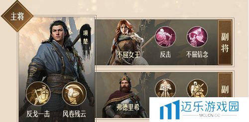 反击枪的核心主将是项羽,第二个人物则是不屈女王,最后补一手弗德里希。这三位都是枪兵种,放一起战斗风格上都是有加成的,通过天赋还有双倍的提升。